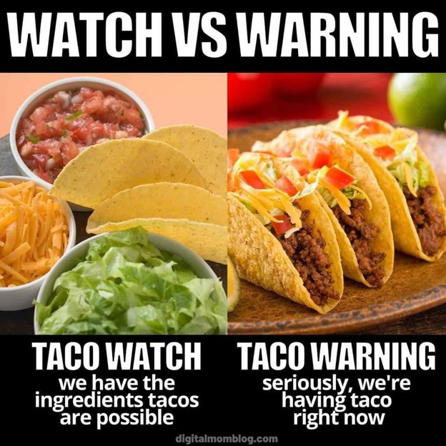 So the next time you sense yourself debating the meaning of a watch vs a warning, think for a second about tacos and respond accordingly.